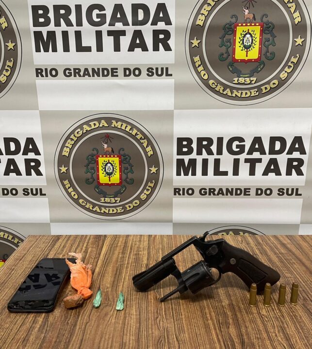 Após receber informações sobre um indivíduo armado, vestindo jaqueta preta, bermuda branca e com cabelo pintado de loiro, em um local conhecido por tráfico de drogas, a Brigada Militar realizou patrulhamento nas proximidades. Na Rua Bom Princípio, os policiais avistaram dois indivíduos caminhando, sendo um deles com características semelhantes às informadas. Ao perceberem a aproximação da viatura, ambos tentaram fugir, mas foram acompanhados e abordados.