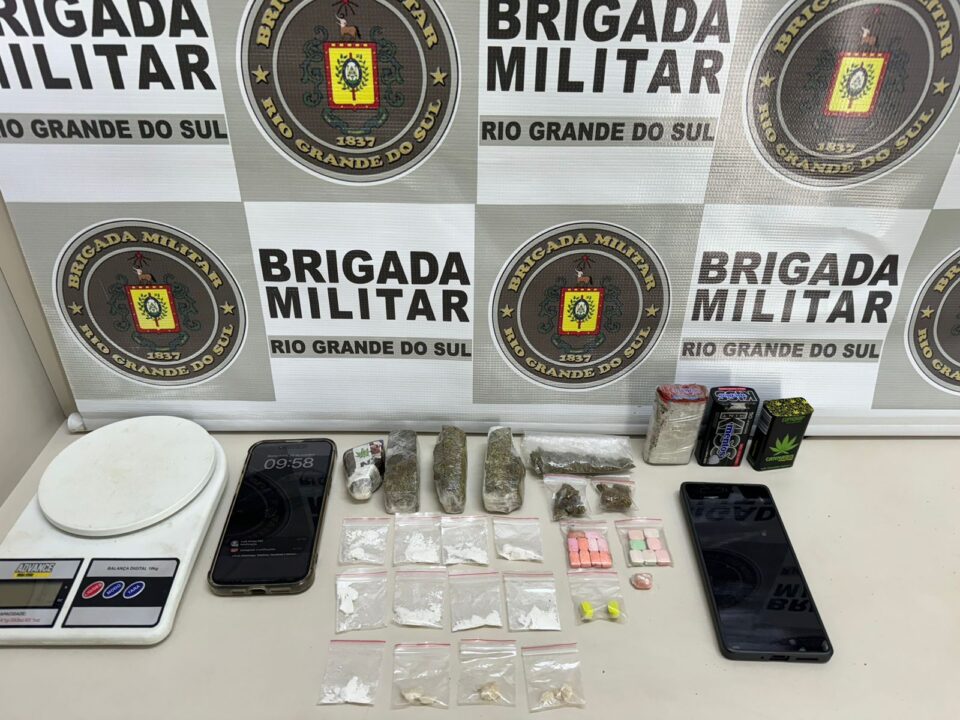 Com os suspeitos, de 30 e 23 anos, foram apreendidos 145,26 gramas de maconha, além de 37,27 gramas de haxixe e dois celulares. Outras drogas também foram encontradas no local, como uma porção de maconha embalada para venda, 19 comprimidos de ecstasy, 9 porções de cocaína, 3 pedras de crack e uma balança de precisão.