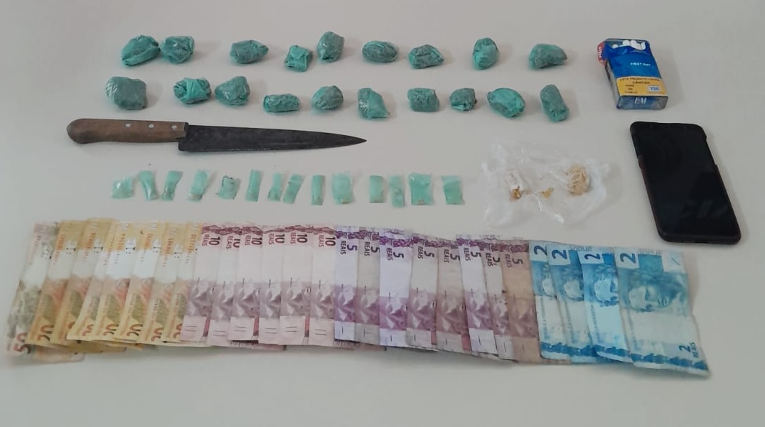 Durante a abordagem, foram encontrados aproximadamente sete gramas de crack, 19 porções de maconha e uma quantia em dinheiro.