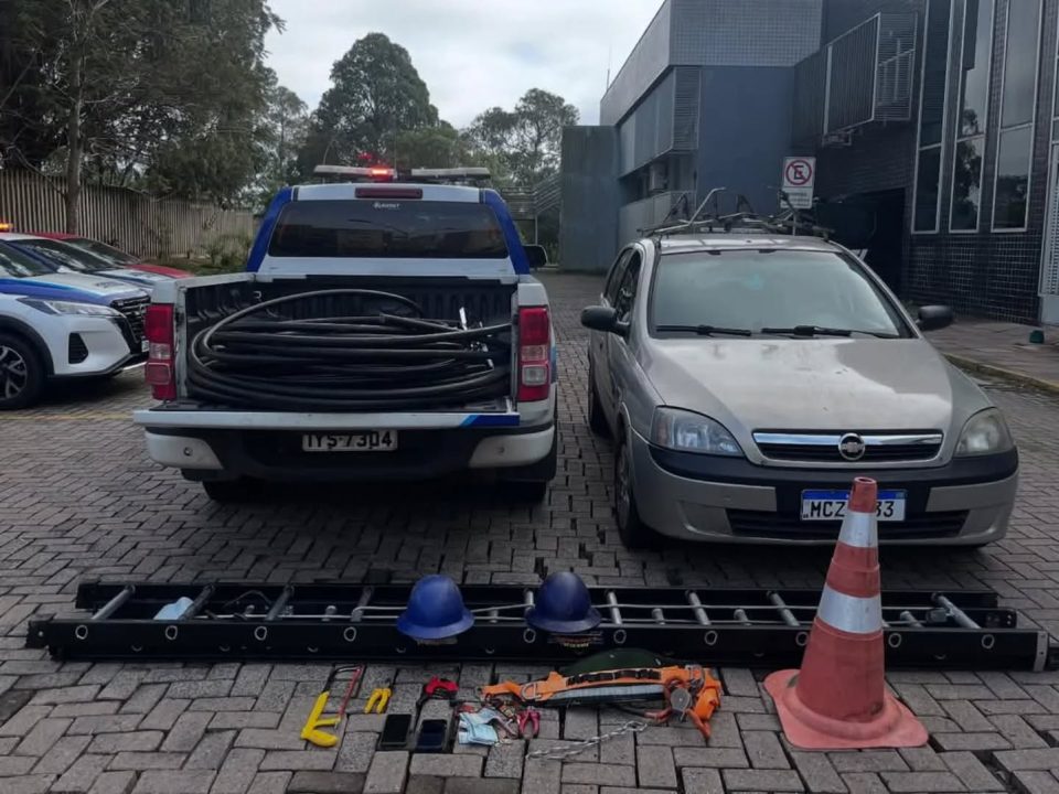 Com a dupla, foram encontrados cerca de 200 quilos de fios de cobre, além de um veículo modelo Corsa, escada, capacetes, alicates, celulares e dinheiro.