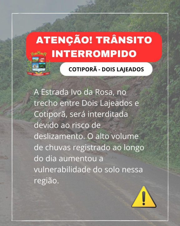 A estrada Ivo da Rosa, no trecho entre Cotiporã e Dois Lajeados, será interditada como medida de precaução diante do risco de deslizamento. A decisão foi tomada pela Prefeitura de Cotiporã após o alto volume de chuvas registrado ao longo desta terça-feira, 17 de junho, que comprometeu a estabilidade do solo na área.