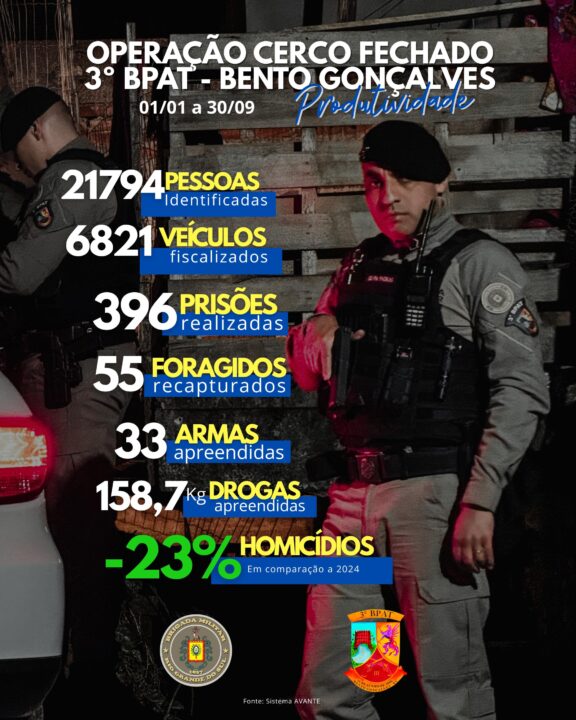 A Brigada Militar, por meio do 3º Batalhão de Policiamento em Áreas Turísticas (3º BPAT), divulgou os resultados da Operação Cerco Fechado em Bento Gonçalves, com dados coletados entre segunda-feira, 1º de janeiro, e segunda-feira, 30 de setembro.