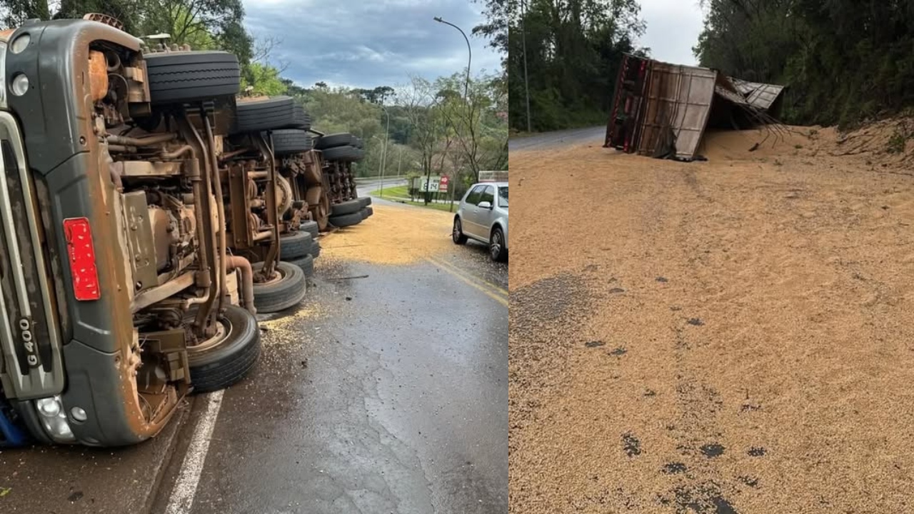 Carreta carregada de soja tomba em Serafina Corrêa após manobra para evitar colisão