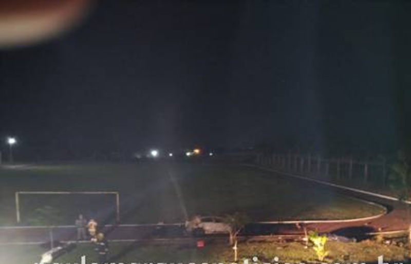 Desgovernado, o carro saiu da pista e caiu dentro de um estádio de futebol localizado às margens da rodovia, onde incendiou.