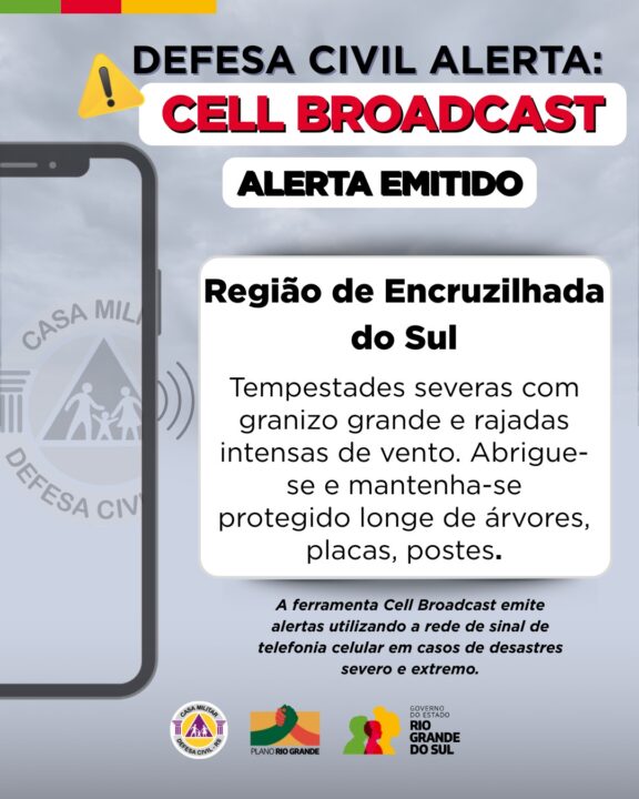 Na noite de domingo, 5 de outubro, foi emitido, pela primeira vez no Rio Grande do Sul, um alerta emergencial utilizando a ferramenta Cell Broadcast. A tecnologia foi acionada para a região de Encruzilhada do Sul diante da aproximação de uma supercélula, uma das formas mais perigosas de tempestade severa.