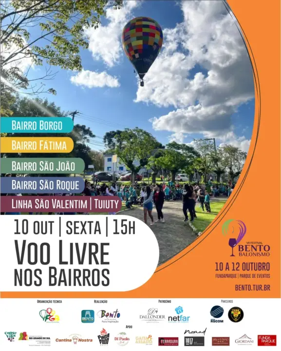 Nesta sexta-feira, 10 de outubro, a partir das 15h, o festival se expande pelos bairros com voos livres, saindo de diferentes pontos da cidade: São Roque (campo do quartel), Borgo (campo do São Paulo), Fátima (campo do Fátima), São Valentin (campo do Flamengo) e São João (Estádio da Montanha).