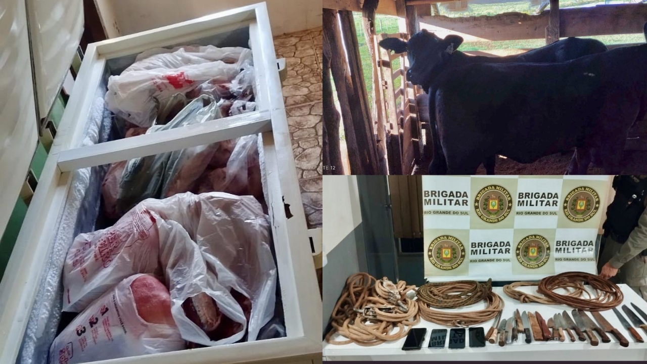 Durante diligências realizadas pela guarnição, foram localizadas duas novilhas com as características dos animais subtraídos e três carcaças bovinas, todas reconhecidas pelo proprietário da estância. Diante das evidências, os dois homens presentes na propriedade foram presos em flagrante, informados de seus direitos constitucionais e algemados conforme a Súmula Vinculante nº 11 do STF, devido ao risco de fuga.