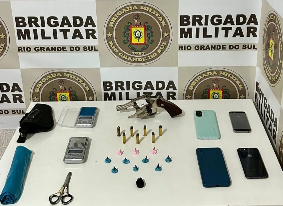 Durante a abordagem, os policiais localizaram com o suspeito de 25 anos três porções de cocaína (2,3 gramas) prontas para a comercialização. Em buscas posteriores, foram encontradas outras sete porções de cocaína (5,9 gramas), uma porção de droga sintética (1,8 gramas), um revólver Taurus calibre 38 com numeração suprimida, sete munições intactas, um coldre, duas balanças de precisão, quatro telefones celulares e material utilizado para o preparo de entorpecentes.