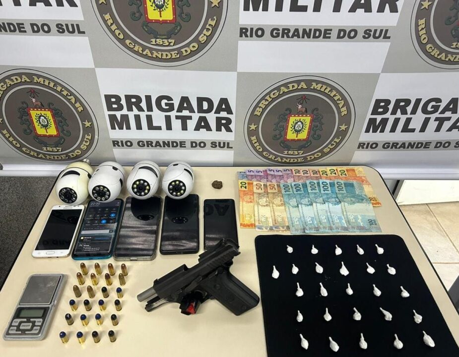 Os suspeitos foram flagrados no momento em que comercializavam entorpecentes. Com eles, a polícia apreendeu uma pistola calibre .380 com a numeração suprimida, 14 munições de calibre .380 e 10 de calibre 9mm, além de 26 porções de cocaína (10g), uma porção de maconha (5g), uma balança de precisão, cinco celulares, R$ 737 em dinheiro e quatro câmeras de videomonitoramento.