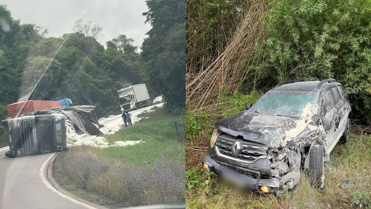 Carreta tomba e atinge automóvel na ERS-324 em Marau