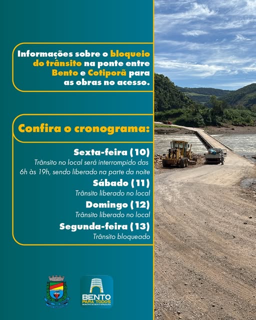 O Instituto de Pesquisa e Planejamento Urbano (IPURB) divulgou o cronograma de bloqueios no trânsito para os próximos dias. Enquanto isso, a Prefeitura de Bento Gonçalves estuda uma rota alternativa para os motoristas durante os períodos de interdição.