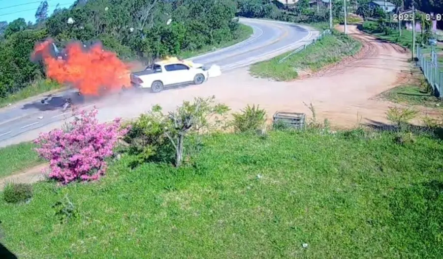 As câmeras de segurança de uma residência registraram o momento em que a motocicleta, ocupada por um casal, colide contra a caminhonete, criando uma explosão no momento da colisão.