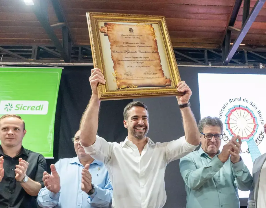 O governador do Rio Grande do Sul, Eduardo Leite, foi homenageado com o título de “Cidadão São-borjense”, concedido pela Câmara de Vereadores de São Borja. A honraria, proposta pelo então vereador e atual deputado estadual Tiago Cadó, foi entregue durante a reunião-almoço da Associação Comercial e Industrial de São Borja (Acisb), dentro da programação da Expofeira. O evento contou com a presença de autoridades como o secretário estadual da Cultura, Eduardo Loureiro, e o líder do governo na Assembleia Legislativa, Frederico Antunes.