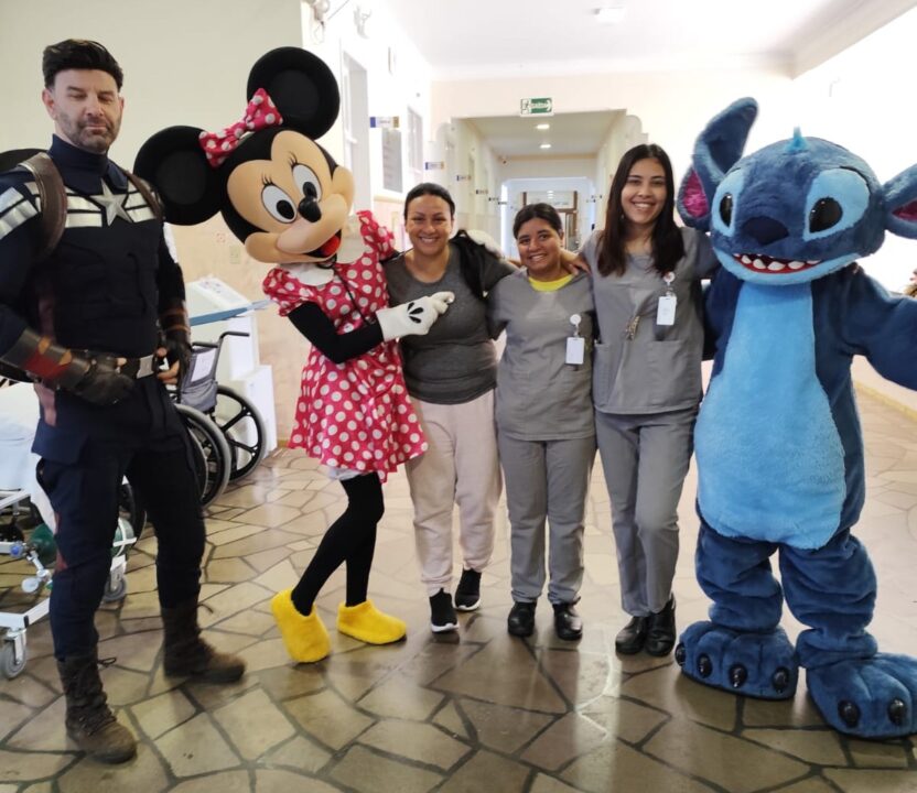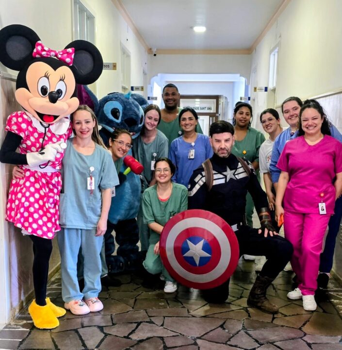 Uma visita repleta de emoção transformou a rotina de pacientes e colaboradores do Hospital São João Batista, em Nova Prata, nesta quarta-feira, 23 de outubro, quando os personagens Capitão América, Minnie e Stitch, da Oficial Liga dos Heróis, levaram sorrisos e carinho a todos os setores da instituição.