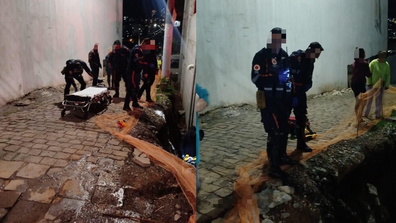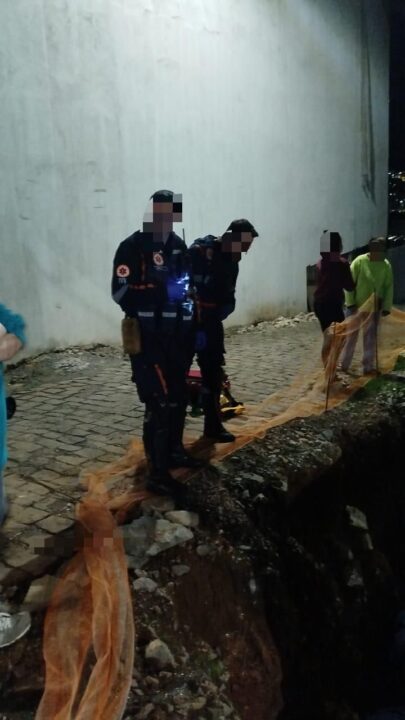Ao chegarem ao local, os bombeiros encontraram um homem caído em um buraco com cerca de quatro metros de profundidade, junto ao alicerce de uma construção. A vítima estava consciente, lúcida e orientada, apresentando escoriações nos membros e um corte na cabeça.
