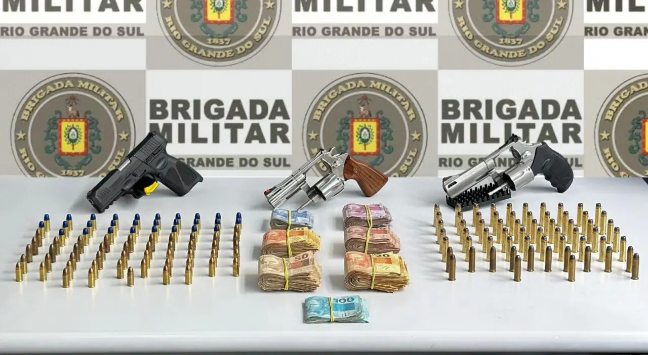 Durante a ação, realizada pelo 12° Batalhão de Polícia Militar (BPM), os policiais apreenderam três armas de fogo — um revólver calibre .357, um revólver calibre .38 e uma pistola calibre 9mm — além de 140 munições de diversos calibres e R$ 11.419,00 em dinheiro.