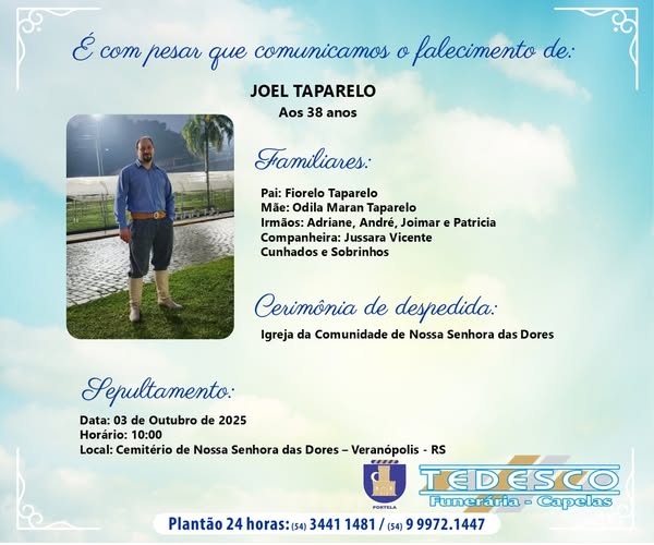 O laudo da necropsia, elaborado pelo IGP, será essencial para esclarecer se a morte ocorreu em razão da queda, de alguma condição de saúde ou por outro fator. A análise do celular da vítima e os depoimentos de testemunhas devem ajudar a compor o quadro investigativo. Joel deixa enlutados o pai, Fiorelo Taparelo, a mãe, Ódia Maran Taparelo, os irmãos Adriane, André, Joimar e Patricia, além da companheira Jussara Vicente, cunhados e sobrinhos.