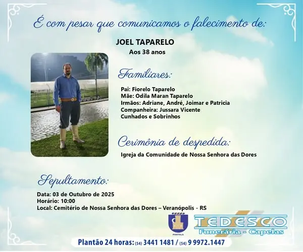 O corpo de Joel Taparelo, de 38 anos, foi encontrado sem vida na tarde de quinta-feira (2), em uma área de difícil acesso próxima à Gruta Selvagem, em Veranópolis (RS). A Brigada Militar e o Instituto-Geral de Perícias foram acionados e contaram com o apoio do Cruzeta Jeep Clube para acessar o local, situado à beira de um desfiladeiro. A cerimônia de despedida foi realizada na Igreja da Comunidade de Nossa Senhora das Dores, e o sepultamento ocorreu na manhã de sexta-feira (3), às 10h, no cemitério da mesma comunidade, em Veranópolis.