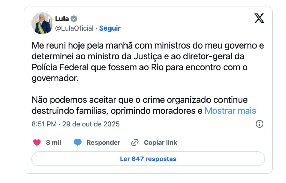 Diante da violenta megaoperação policial no Rio de Janeiro, que resultou em mais de uma centena de mortes, o presidente Luiz Inácio Lula da Silva defendeu uma resposta firme, mas estratégica, ao crime organizado. Em publicação nas redes sociais, ele enfatizou que “não podemos aceitar que o crime organizado continue destruindo famílias”, e pediu que o enfrentamento ao tráfico preserve a vida de inocentes e agentes de segurança. Lula ainda destacou a necessidade de ações integradas, voltadas a enfraquecer a estrutura financeira das facções.