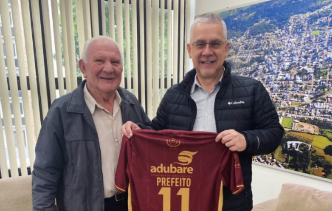 Olímpio Gasparin entrega camisa do E.C. São Valentim ao prefeito de Veranópolis em gesto simbólico de união