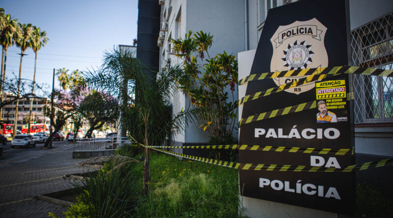 O Palácio da Polícia, em Porto Alegre, foi interditado simbolicamente pela UGEIRM Sindicato na manhã desta terça-feira, 21 de outubro, em um ato de protesto contra as precárias condições de trabalho nas delegacias gaúchas e o abandono enfrentado pelos policiais civis.