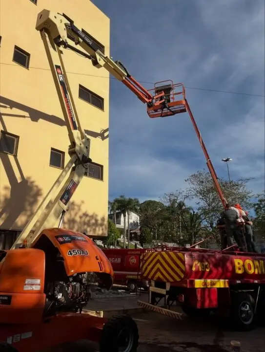 As guarnições do SCAB realizaram o acesso ao ponto elevado por meio de uma escada escalonada e, utilizando técnicas especializadas de resgate, efetuaram a descida assistida e segura dos dois trabalhadores, que saíram ilesos do incidente.