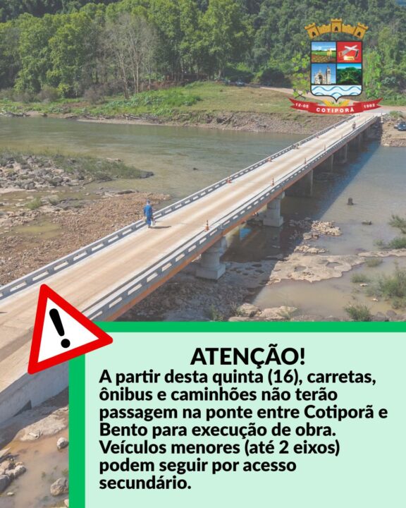 A partir de quinta-feira, 16 de outubro, carretas, ônibus e caminhões não poderão trafegar pela ponte que liga Cotiporã a Bento Gonçalves, na Serra Gaúcha. A interdição ocorre devido às obras no acesso da ponte pelo lado de Faria Lemos.
