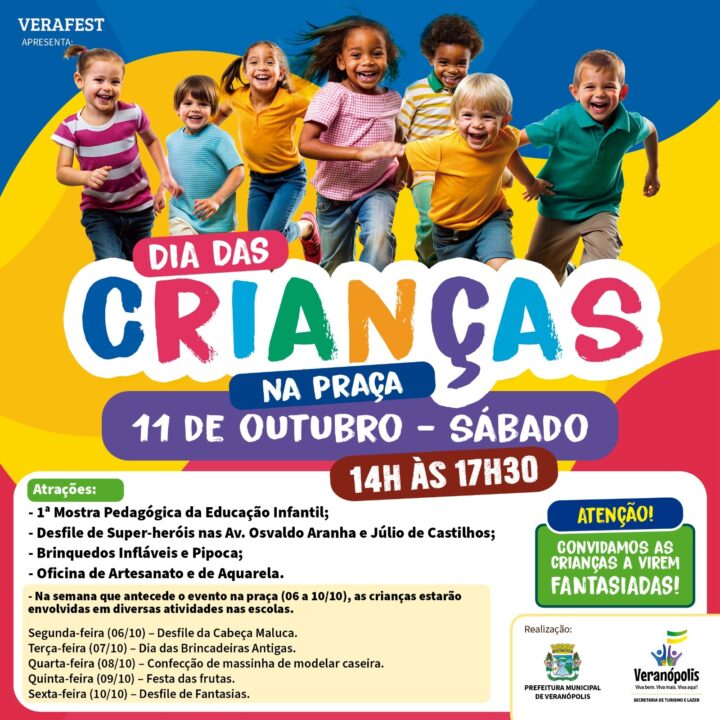 Veranópolis terá uma programação especial para celebrar o Dia das Crianças. O ponto alto será o evento “Dia da Criança na Praça”, que acontece no sábado, 11 de outubro, das 14h às 17h30min. A atividade na Praça contará com diversas atrações lúdicas e culturais voltadas para toda a família.