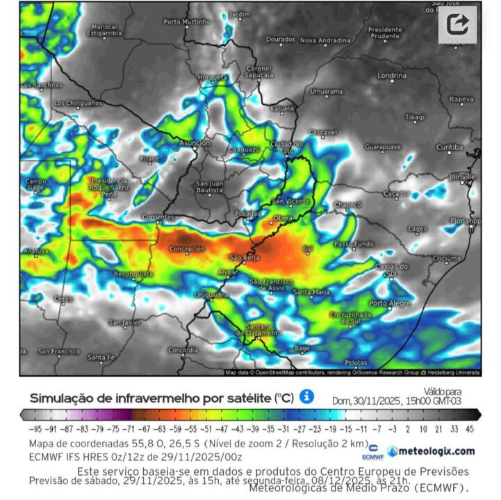 Durante a manhã, células convectivas avançam sobre o sul e o oeste do Rio Grande do Sul. Entre a tarde e a noite, o aquecimento diurno e o reforço da umidade em baixos níveis favorecem a formação de tempestades severas também em Santa Catarina e no Paraná, de forma mais isolada.