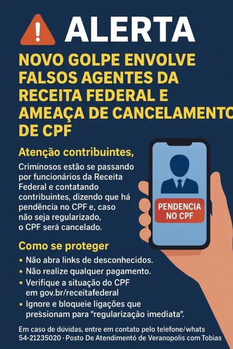 Um novo golpe tem assustado contribuintes em várias regiões do país. Estelionatários estão se passando por falsos agentes da Receita Federal, entrando em contato por telefone, WhatsApp, SMS ou e-mail, e alegando que há uma “pendência urgente no CPF”. As mensagens afirmam que, caso a suposta “regularização imediata” não seja feita, o CPF será bloqueado ou cancelado.