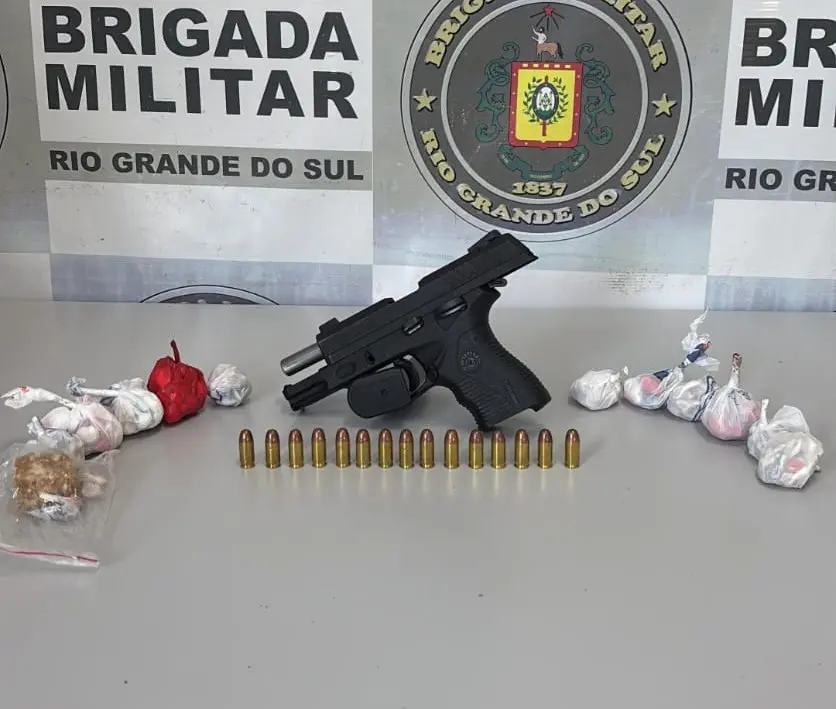 A prisão ocorreu durante patrulhamento de rotina, quando os policiais abordaram um veículo Kia Sorento conduzido pelo suspeito. Na ação, foram apreendidos uma pistola calibre .380 com 15 munições, além de porções de cocaína e crack prontas para a venda.