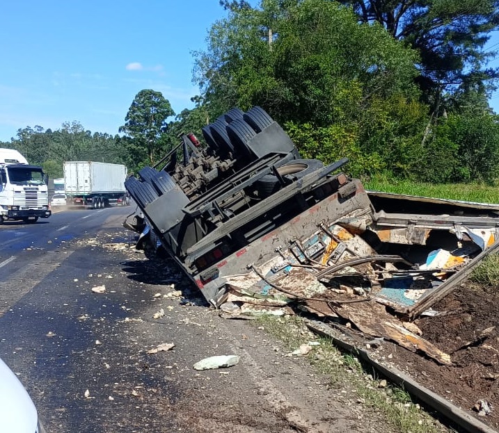 Um caminhão tombou na BR-386, na altura do município de Montenegro, e interditou parte da pista no sentido capital gaúcha, na tarde desta terça-feira (18). Apesar do impacto visual do acidente, ninguém se feriu. A ocorrência envolveu apenas danos materiais, segundo as autoridades que atenderam o caso.