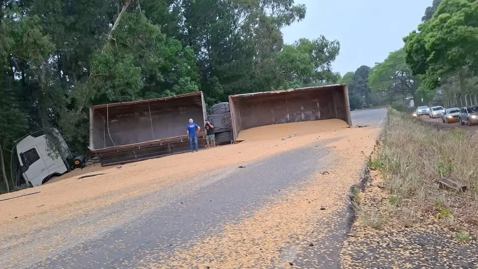 O caminhão transportava cerca de 35 toneladas de milho, que ficaram espalhadas sobre a pista, bloqueando parcialmente a rodovia. Equipes do Policiamento Rodoviário atuam na orientação do trânsito, mas enfrentam dificuldades de comunicação entre a base e os agentes que estão no local.