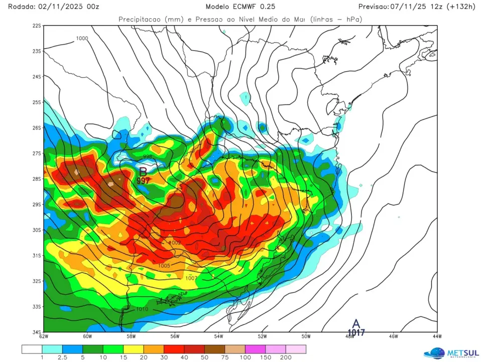 O Rio Grande do Sul pode enfrentar condições meteorológicas extremamente severas entre os dias 7 e 8 de novembro com a formação de um ciclone intenso sobre a região, alerta a Metsul. Modelos internacionais e de inteligência artificial convergem para a possibilidade de uma ciclogênese a partir de uma área de baixa pressão, que se aprofundará rapidamente, gerando chuvas volumosas, tempestades e vendavais. O ponto mais crítico do evento deve ocorrer na sexta-feira (7), com acumulados de chuva entre 50 mm e 100 mm em muitas cidades gaúchas, podendo ultrapassar os 100 mm em pontos isolados — cenário que eleva o risco de alagamentos e transtornos urbanos, especialmente em Porto Alegre e entorno.