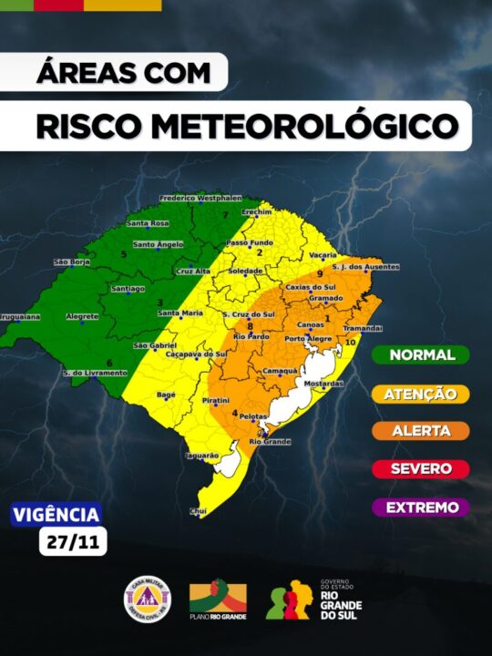 O Centro de Monitoramento da Defesa Civil do Rio Grande do Sul atualizou as condições meteorológicas para sexta-feira, 28 de novembro, e emitiu alerta para tempestades acompanhadas de queda de granizo, chuva forte, raios e rajadas de vento que podem ultrapassar 90 km/h em diversas regiões do Estado.
