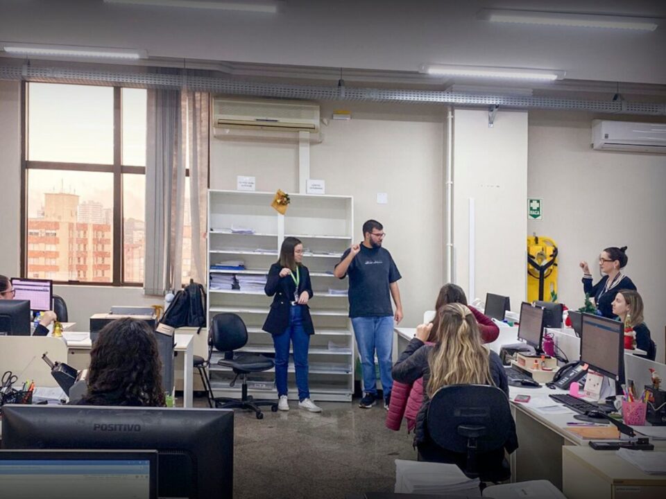 Para tornar o aprendizado mais acessível, Vitória conta com o apoio de Luis Filipe Borges Poletto, colega de setor e filho de pais surdos, que atua como uma ponte essencial na comunicação.