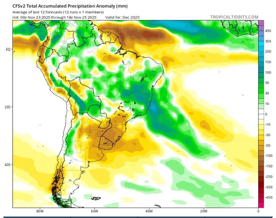 Com esse cenário, o Norte, a Amazônia e parte do Centro-Oeste tendem a registrar volumes de chuva acima da média, impulsionados pela convecção fortalecida e por umidade abundante vinda do Atlântico. Já o Sul do Brasil, além do Paraguai, Uruguai e setores da Argentina, aparece nas projeções com anomalias negativas de precipitação, resultado da migração dos principais corredores de instabilidade para regiões mais ao norte.