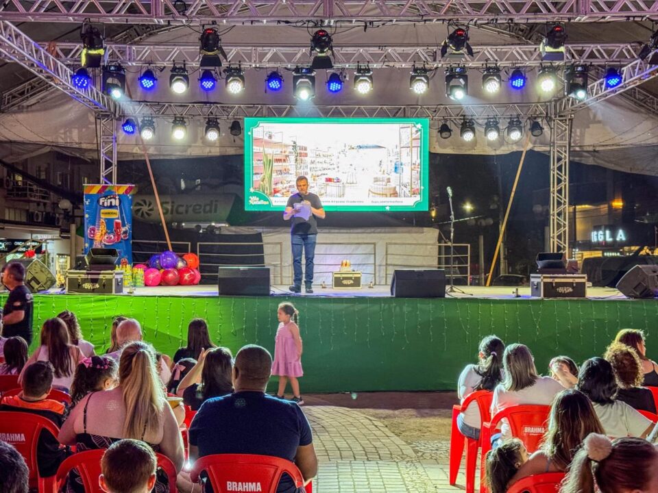 A noite contou com apresentação da banda Os Peraltas, que animou o público com músicas, personagens e interação, garantindo diversão às crianças e encantando toda a família.