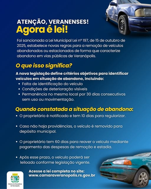 Entrou em vigor a Lei Municipal nº 197, de 15 de outubro de 2025, que define normas para a remoção de veículos abandonados ou estacionados de forma irregular nas vias públicas de Veranópolis. A legislação estabelece critérios objetivos para caracterizar o abandono, como a ausência de identificação no veículo, sinais visíveis de deterioração e a permanência no mesmo local por 30 dias consecutivos sem movimentação.