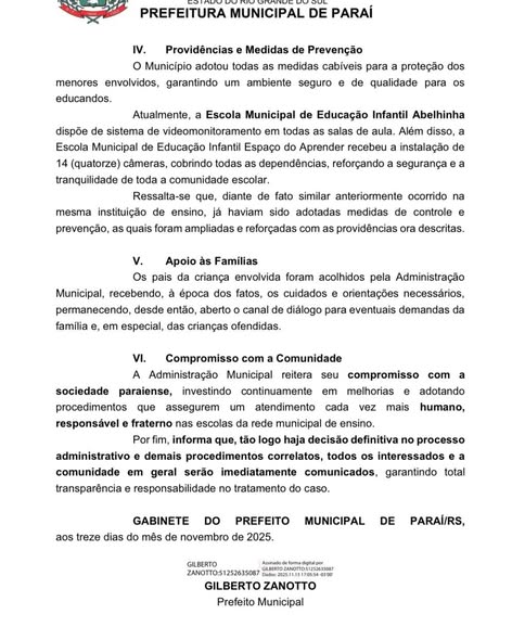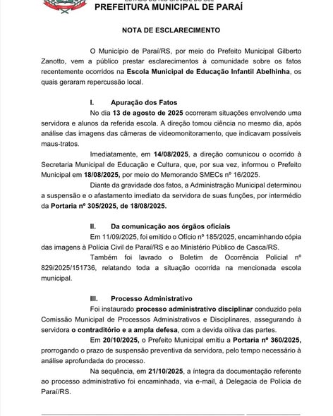 A administração municipal de Paraí/RS divulgou uma nota de esclarecimento sobre os fatos ocorridos na Escola Municipal de Educação Infantil Abelhinha, ressaltando que todas as medidas cabíveis já foram devidamente adotadas.