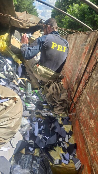 PRF e Brigada Militar apreendem caminhão com mais de 90 mil maços de cigarros contrabandeados na BR-386
