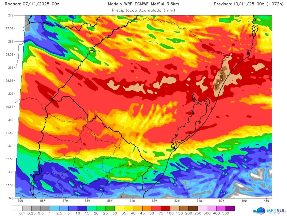 A MetSul Meteorologia emitiu um alerta para o elevado risco de chuva excessiva de natureza orográfica no Litoral Norte do Rio Grande do Sul e no Sul de Santa Catarina nas próximas horas. Os acumulados de precipitação podem variar de 100 mm a 200 mm entre esta sexta-feira e sábado, superando a média histórica mensal em pouco tempo. Essa chuva volumosa estará associada à circulação de um ciclone extratropical que avança de terra para o mar aberto na região.