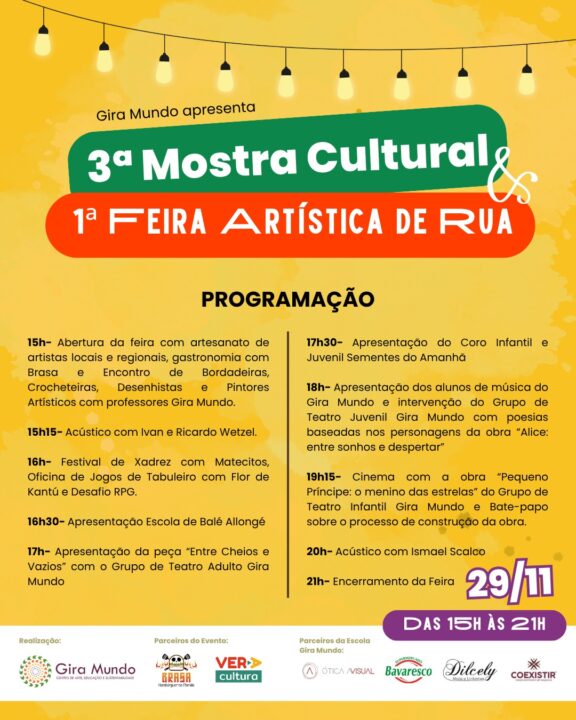A frente do Espaço Gira Mundo, em Veranópolis, será palco de um dia repleto de arte, cultura e diversão com a realização da 3ª Mostra Cultural e da 1ª Feira Artística de Rua, neste sábado, 29 de novembro, a partir das 15h. O evento segue até as 21h, oferecendo uma programação diversificada e gratuita para toda a comunidade.