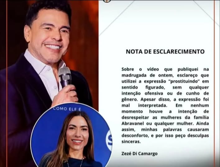 O cantor Zezé Di Camargo publicou, nas suas redes sociais, uma nota de esclarecimento após a forte repercussão de um vídeo divulgado na madrugada anterior. Na mensagem, o sertanejo afirmou que a expressão utilizada foi empregada em sentido figurado, sem qualquer intenção ofensiva ou de cunho de gênero.