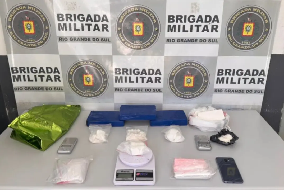 Durante a ação, os policiais apreenderam três tijolos de cocaína pesando 3.101 gramas e outras seis porções da mesma substância, totalizando 1.276 gramas, além de três balanças de precisão, um aparelho celular, uma sacola verde e diversos pacotes tipo zip lock, utilizados para preparo e acondicionamento da droga.