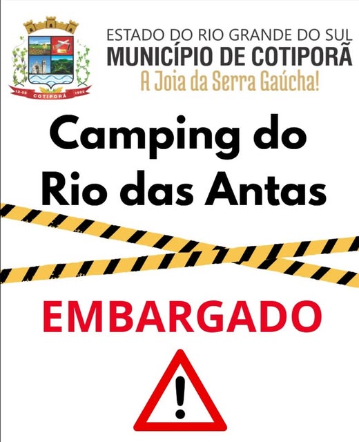 A Prefeitura de Cotiporã informa que o Camping do Rio das Antas encontra-se temporariamente embargado, conforme decisão tomada após vistoria conjunta da Polícia Ambiental (PATRAM) e da Fiscalização Municipal.