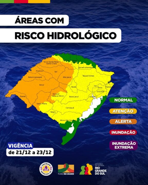De acordo com o boletim, o mapa hidrológico classifica em amarelo as áreas em condição de atenção e em laranja as regiões em alerta, onde há risco de elevações rápidas em arroios, córregos e rios menores, além de alagamentos urbanos e enxurradas pontuais em locais de maior declividade.