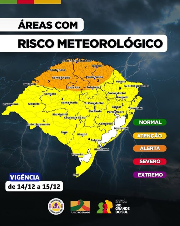 O Centro de Monitoramento da Defesa Civil Estadual emitiu um alerta para a ocorrência de temporais isolados e chuva intensa nos próximos dias em diversas regiões do Rio Grande do Sul. A atuação de uma área de baixa pressão e o avanço de uma frente fria devem provocar instabilidades entre domingo, 14 de dezembro, e segunda-feira, 15 de dezembro.