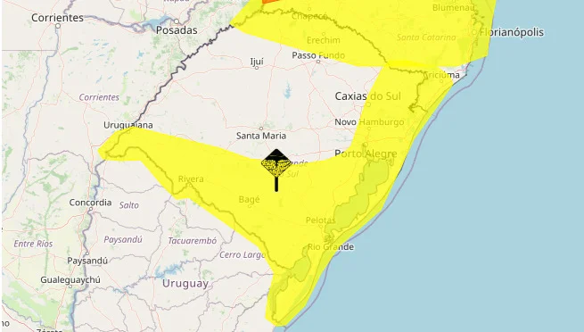 O Rio Grande do Sul está sob dois alertas de tempestade emitidos pelo Instituto Nacional de Meteorologia (Inmet) nesta sexta-feira (12). Os avisos são de nível amarelo, o que significa que o fenômeno previsto é potencialmente perigoso, embora com risco considerado moderado. A previsão inclui chuvas intensas, rajadas de vento e possibilidade de queda de granizo.