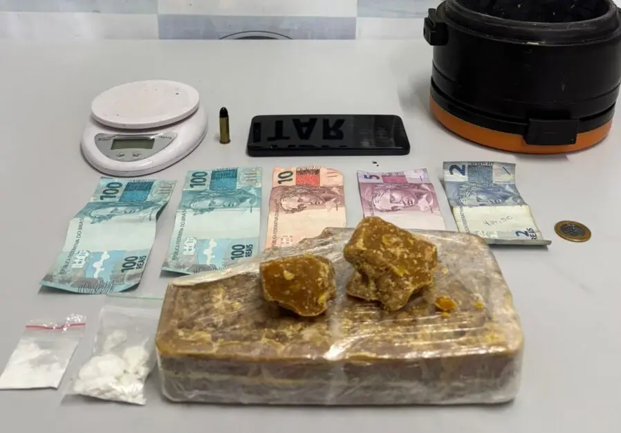 Com a dupla, os agentes encontraram cerca de 893 gramas de crack, porções de cocaína, dinheiro em espécie, uma munição calibre .38, uma balança de precisão e celulares, indicando atividade relacionada ao tráfico. O material foi apreendido e encaminhado para a delegacia juntamente com os suspeitos, que foram presos em flagrante.